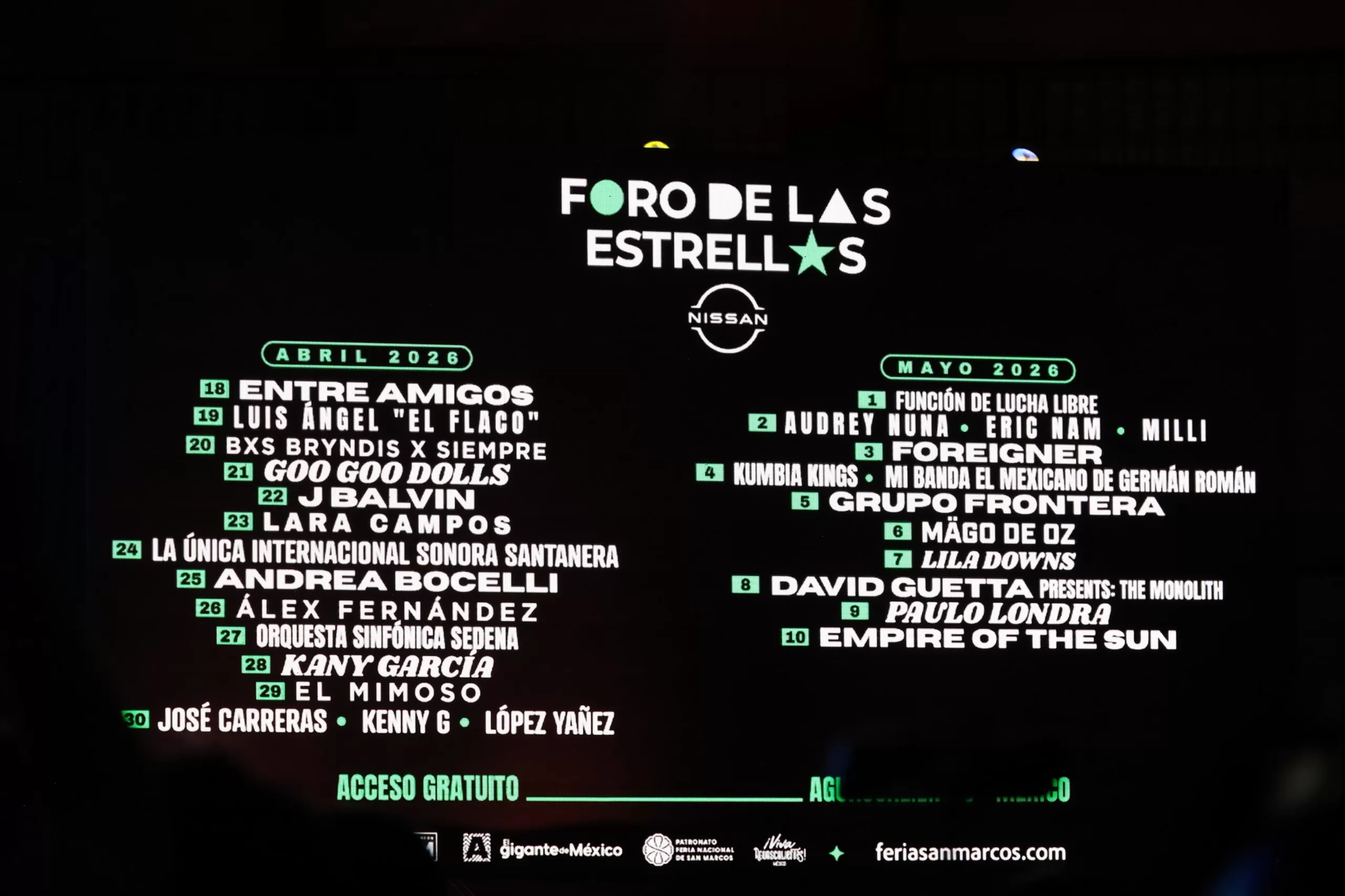 * Goo Goo Dolls, J Balvin, Andrea Bocelli, Kany García, Grupo Frontera y David Guetta encabezan el destacado elenco del Foro de las Estrellas Nissan* La comunidad de Madrid, España, y el estado de Chihuahua serán los invitados de esta edición* La edición 198 de la Feria Nacional se realizará del 18 de abril al 10 de mayoCon la Plaza de Toros Monumental como escenario y una atmósfera cargada de emoción y expectativa, la gobernadora de Aguascalientes, Tere Jiménez, presentó el Programa Oficial de la Feria Nacional de San Marcos (FNSM) 2026, marcando el inicio de la cuenta regresiva para la fiesta más grande y esperada del país.Tere Jiménez afirmó que la Feria Nacional de San Marcos 2026, en su edición 198, es “la más grande e importante de México” y una celebración que muestra al país y al mundo lo mejor de Aguascalientes. Destacó que del 18 de abril al 10 de mayo, la feria ofrecerá espectáculos de talla internacional, arte, cultura, gastronomía, deporte y talento local, en espacios emblemáticos como el Foro de las Estrellas Nissan, la Plaza de Toros Monumental, el Teatro Morelos y la Isla San Marcos.Subrayó que la feria es una experiencia abierta para todas las edades y para visitantes nacionales e internacionales. “Aquí iniciamos el camino hacia una tradición que une a las generaciones y que es una puerta abierta para todos”, expresó, al señalar que la verbena se vivirá en más de 93 hectáreas llenas de color, música y alegría.Finalmente, resaltó que este año la fiesta lucirá aún más con la Comunidad de Madrid, España, y el estado de Chihuahua como invitados de honor, y enfatizó: “La Feria Nacional de San Marcos es color, alegría, fortaleza y, sobre todo, identidad; una gran fiesta que nos recuerda quiénes somos y que demuestra que en Aguascalientes hacemos las cosas bien. Una vez más, la feria dejará huella en la historia. ¡Que viva Aguascalientes! ¡Que viva México y que viva la Feria Nacional de San Marcos!”, destacó.En el momento más esperado de la noche, la gobernadora del Estado anunció el elenco del Foro de las Estrellas Nissan, el cual estará conformado por artistas de talla nacional e internacional, consolidando una propuesta musical diversa y de alto nivel que atraerá a miles de asistentes, siendo esta la programación:18 de abril, Entre Amigos 19 de abril, Luis Ángel “El Flaco”20 de abril, Bryndis por Siempre 21 de abril, Goo Goo Dolls22 de abril, J Balvin23 de abril, Lara Campos24 de abril, La Sonora Santanera25 de abril, Andrea Bocelli 26 de abril, Álex Fernández 27 de abril, Orquesta Sinfónica Militar28 de abril, Kany García 29 de abril, El Mimoso30 de abril, José Carreras, Kenny G y López Yáñez 1.º de mayo, Función de Lucha Libre2 de mayo, Audre y Nuna, Eric Nam y Milli3 de mayo, Foreigner4 de mayo, Kumbia Kings y Mi Banda El Mexicano 5 de mayo, Grupo Frontera6 de mayo, Mägo de Oz7 de mayo, Lila Downs8 de mayo, David Guetta9 de mayo, Paulo Londra10 de mayo, Empire of the SunDurante su intervención, el presidente del Patronato de la FNSM, José Ángel González Serna, destacó la relevancia histórica, cultural y económica de la verbena más importante del país, así como su constante evolución y proyección más allá de las fronteras.“La cultura está hecha para ser compartida. Cuando las costumbres de distintos lugares entran en contacto e intercambian sus mejores aspectos, estas crecen y nos hacen crecer como personas”, expresó.Añadió que el serial taurino es y seguirá siendo un pilar central de la FNSM, adelantó que en esta edición participarán toreros internacionales como Andrés Roca Rey, Daniel Luque, Marco Pérez, Juan Ortega y Guillermo Hermoso de Mendoza, así como los mexicanos Héctor Gutiérrez, Diego San Román, Luis David, Diego Sánchez, Leo Valadez y Emiliano Gamero.Finalmente, González Serna señaló que esta edición contará con más de 70 cámaras de videovigilancia de última generación para que las familias disfruten de una feria segura y con tranquilidad.Además, la oferta cultural de la FNSM incluirá más de 2 mil eventos, de los cuales el 80 por ciento serán gratuitos, diseñados para públicos de todas las edades. Destacan espacios como el Ferial, el Foro del Lago, que contará con artistas como Jumbo, Caloncho, Gepe y Hello Seahorse!, entre otros; el Corredor Carranza y la Isla San Marcos. Asimismo, se llevará a cabo el Encuentro Nacional de Arte Joven, se celebrará el Premio Bellas Artes de Poesía y se desarrollarán diversos eventos deportivos.El evento culminó con un impresionante espectáculo de pirotecnia y la tradicional Pelea de Gallos.También estuvieron presentes el señor Luis Alberto Villarreal García; Aurora Jiménez Esquivel, primera voluntaria y presidenta del DIF Estatal; Leonardo Montañez Castro, presidente municipal de Aguascalientes; Irma Cristina Flores Álvarez, esposa del presidente del Patronato de la FNSM, y Julio Chávez, director del Fideicomiso de Promoción Turística del Estado de Chihuahua.